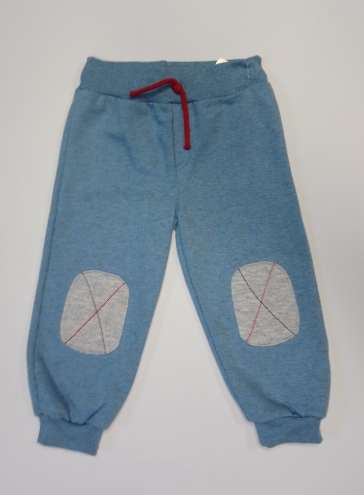 Niebieskie spodnie dresowe wykonane z miękkiej dresówki. Na nogawkach naszyte zostały szare łaty, w pasie ozdobny czerwony sznureczek.