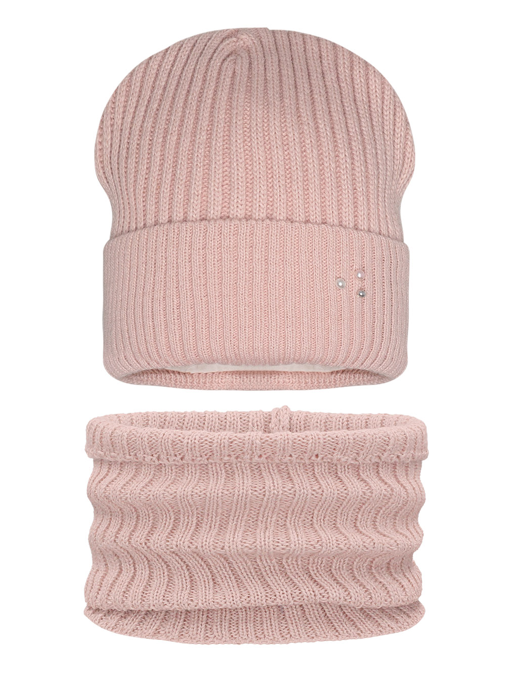 Komplet na zimę dla dziewczynki z czapką beanie. Od spodu podszyta jest miłą dla dziecka bawełną. Z boku doszyte ozdobne trzy perełki.