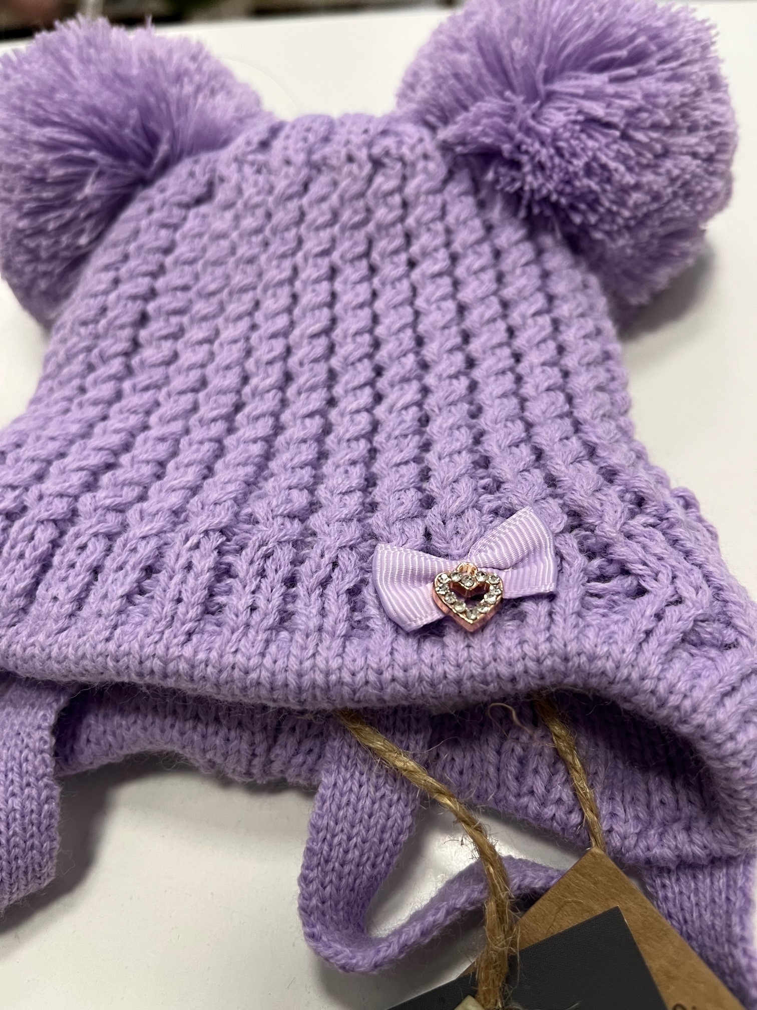 Czapka z dwoma pomponami. Ozdobiona naszywką w postaci kokardki z serduszkiem z błyskotkami. Podszyta naturalną bawełną. Dobierając rozmiar czapki, wybierz o 1 cm mniejszy niż obwód, np. gdy głowa Dziecka ma 45 cm obwodu to wybieramy rozmiar 44/46 cm.