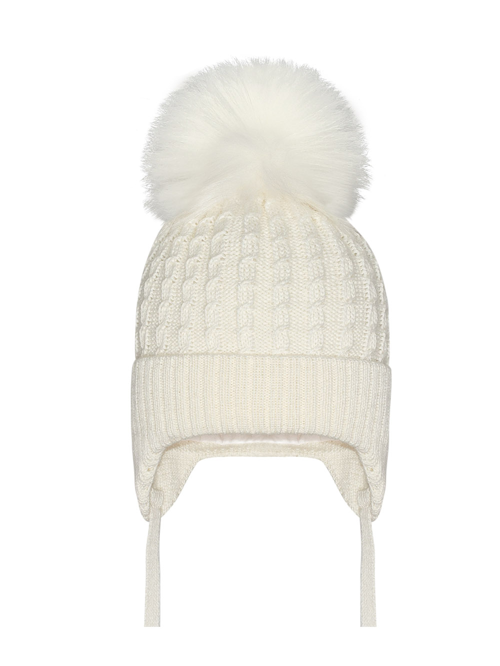 Wiązana czapka polskiej firmy Barbaras. KOLOR Kremowy. WŁOCHATY Pompon. Od spodu czapka podszyta jest przyjemną dla skóry bawełną.