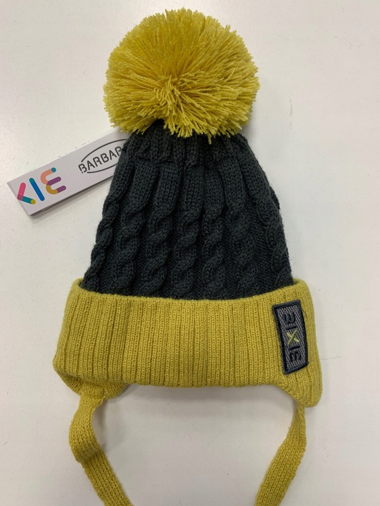 Szaro-żółta, wiązana czapeczka firmy Barbaras z pomponem