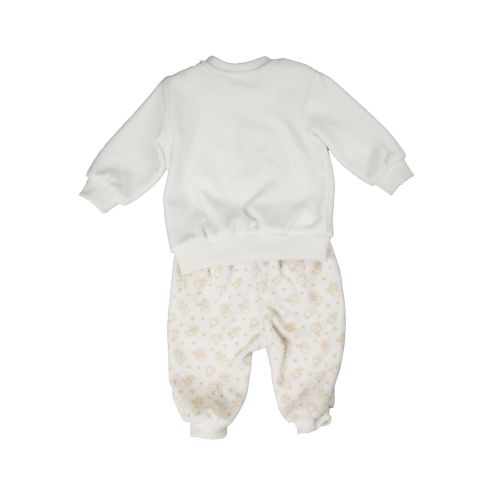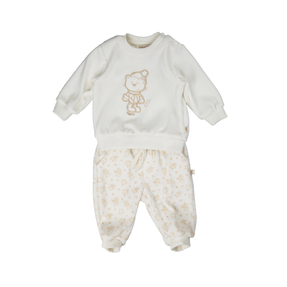 Dwuczęściowy welurowy komplet bluza + spodnie dresowe w kremowym kolorze. Komplet sprawdzi się idealnie zarówno dla chłopca jak i dla dziewczynki na chłodne dni. Bluza jest rozpinana na ramionach, aby łatwiej można było ubrać maleństwo. Aplikacja z misiem z przodu na bluzie dodaje całości dziecięcego charakteru. Bluza posiada ściągacz w rękawach i w dolnej części, co sprawia że bluza jest wygodniejsza do noszenia. Spodnie dresowe również są w kremowym kolorze z aplikacją na całości co podkreśla dziecięcy charakter. Spodnie są z gumką w pasie i posiadają ściągacze w nogawkach. Miły w dotyku, wykonany z wysokiej jakości bawełny komplet z pewnością sprawdzi się na co dzień dla każdego maleństwa.