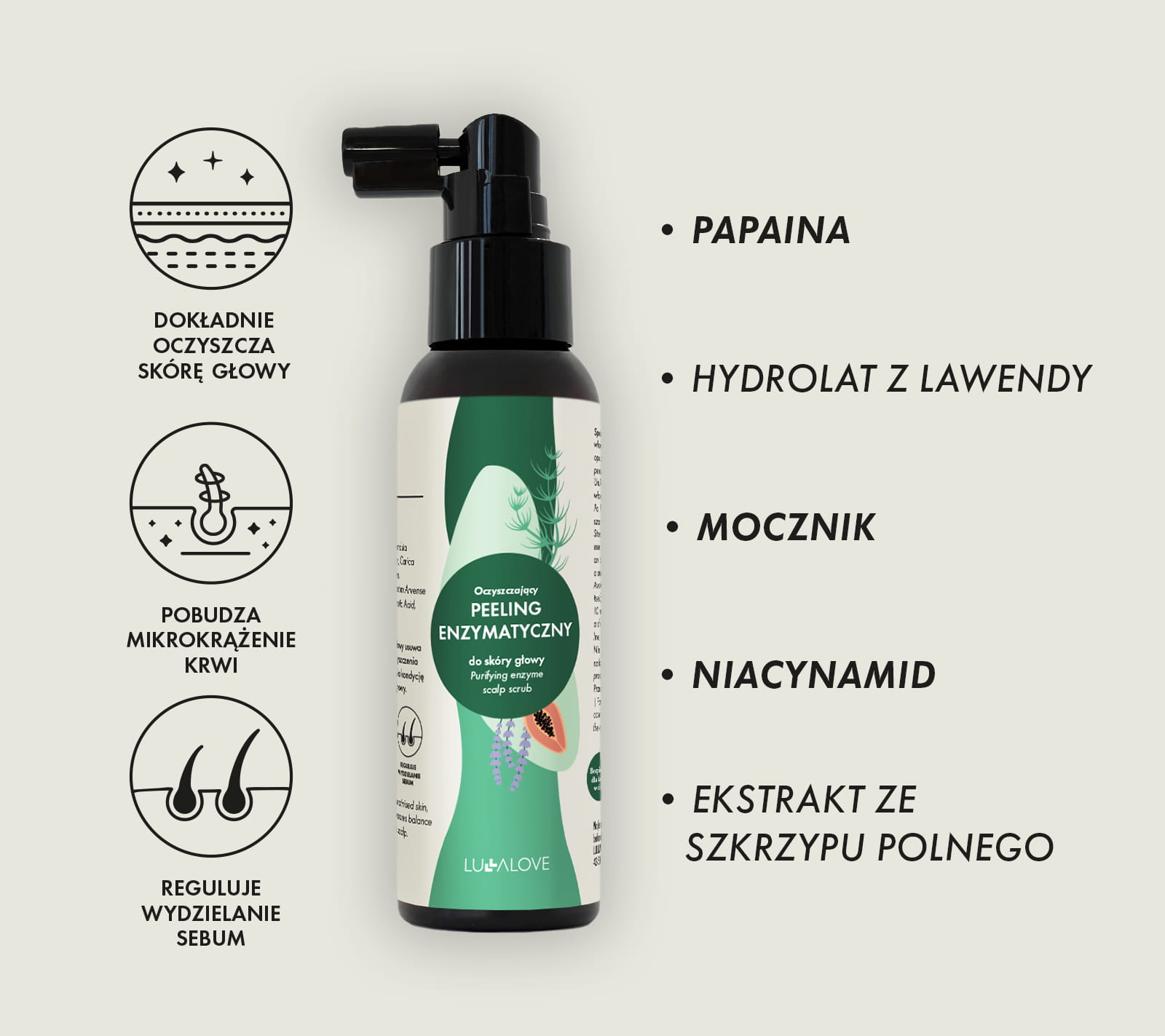 Papaina, mocznik, hydrolat z lawendy, niacynamid, ekstrakt ze skrzypu polnego.