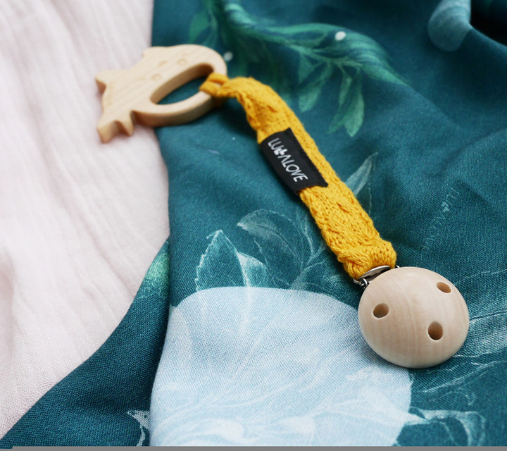 Połączenie przędzy w splocie warkocza i naturalnego drewna w praktycznej zawieszce do smoczka i gryzaka.