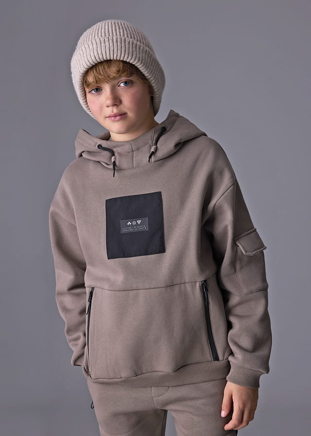 Bluza dla chłopca z kapturem. Kaptur posiada sznureczki umożliwiające ściśnięcie, a stójka pod szyją posiada z boku wycięcia przez które sznurek został dodatkowo przeciągnięty tworząc ciekawy efekt. W rękawach i na dole ubranka elastyczne ściągacze dla lepszego dopasowania. Z przodu aplikacja w kontrastowym kolorze oraz dwie kieszenie, tył gładki. Dodatkowa kieszeń została umieszczona na jednym z rękawów.