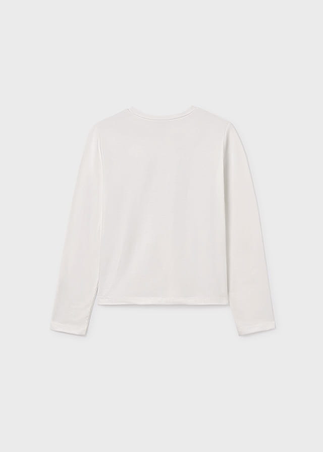 Bluzka z długim rękawem dla dziewczynki. Pod szyją okrągły dekolt. Z przodu aplikacja z haftem .