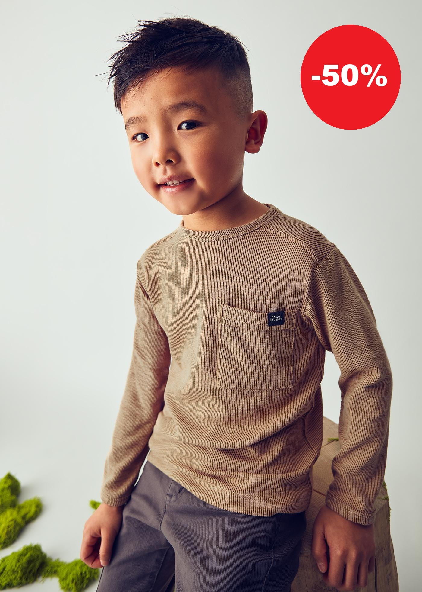 Bluzka z długim rękawem. Okrągły dekolt. Kieszonka z przodu ubranka, tył gładki. Model został wykonany z elastycznej i prążkowanej tkaniny.