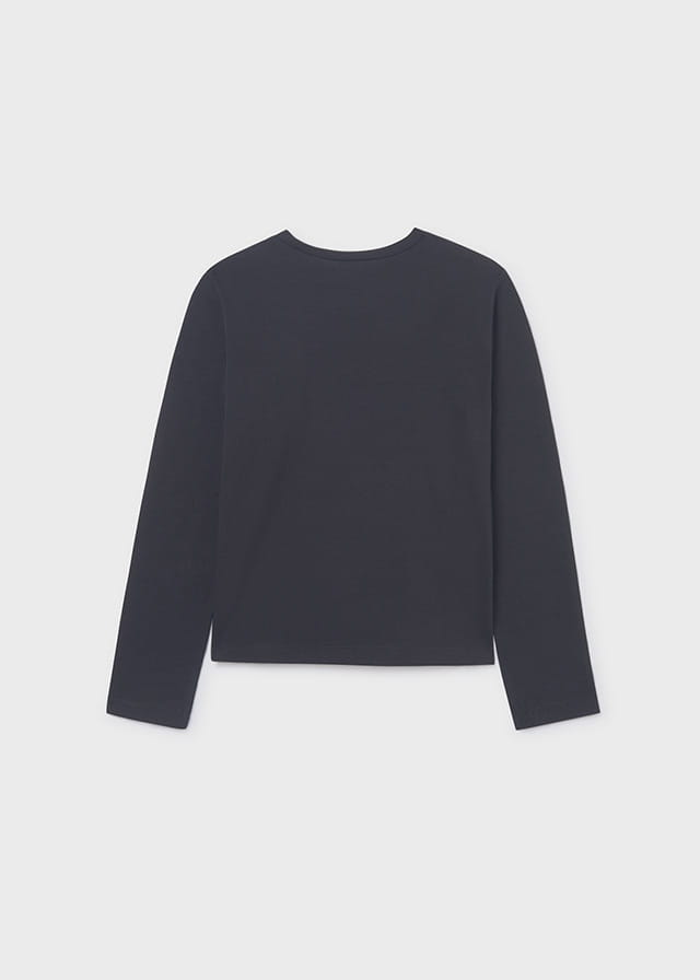 Koszulka z długim rękawem dla dziewczynki. Okrągły dekolt. Delikatna i elastyczna bawełna. Aplikacja z przodu ubranka, tył gładki.