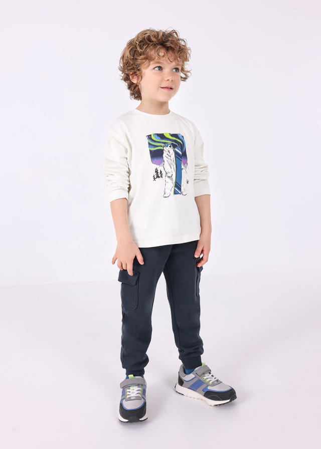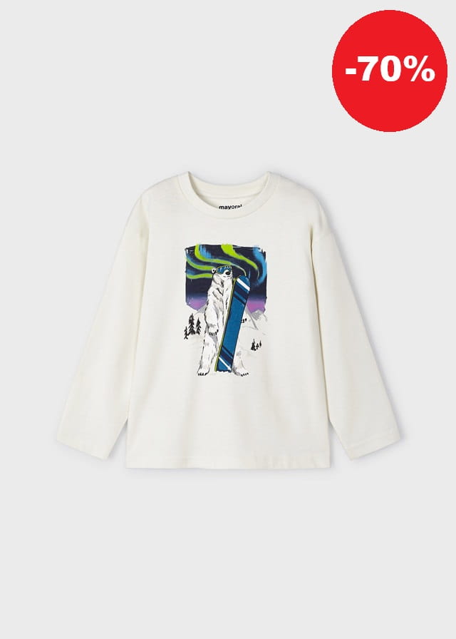 Koszulka z długim rękawem dla chłopca. Okrągły dekolt. Model z nadrukami z przodu ubranka. Artykuł wykonany ze 100% bawełny.