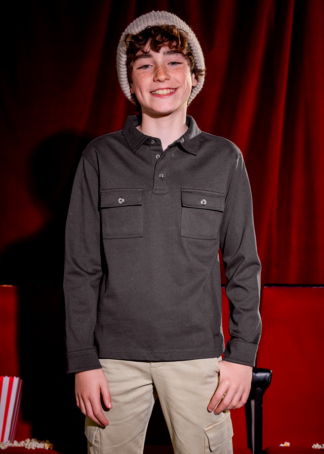 Bluzka z długim rękawem z kołnierzem typu polo. Krój prosty, elastyczna i ciepła tkanina. Z przodu dwie kieszenie zapinane na guziki. W rękawach mankiety zapinane na dwa guziki.
