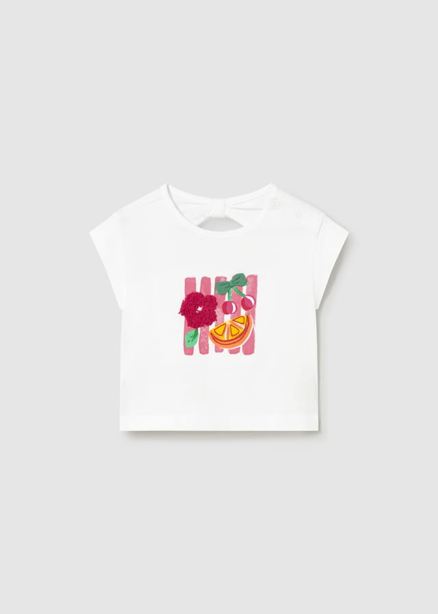 Koszulka z krótkim rękawem z uroczą aplikacją z przodu ubranka. Aplikacja z doszytą kokardką, haftem i "włochatym" owocem. Model o szerszym kroju. Tył z wycięciem w górnej części pleców. Na ramieniu zapięcie na napy
