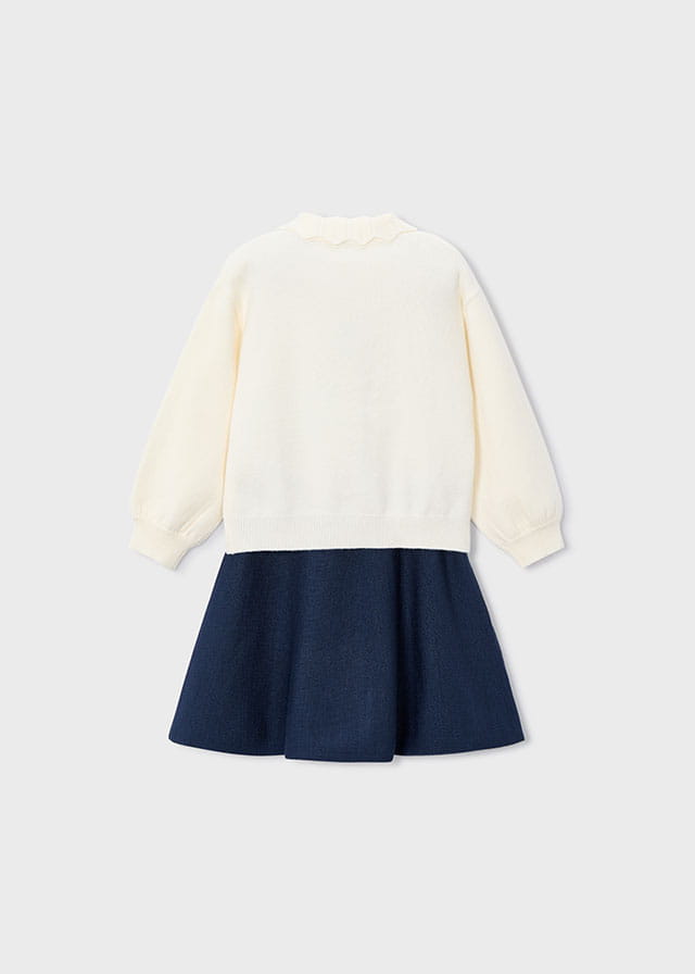 Komplet składa się z dzianinowej spódniczki w kolorze granatowym oraz z bluzki sweterkowej.