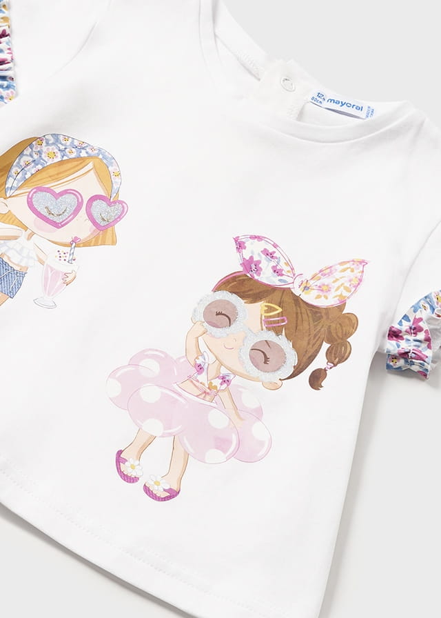 Bawełniana bluzka z krótkim rękawem. Krój prosty. Ubranko ozdobione falbanami na rękawach. Zapięcie z tyłu na ukryte napy. W górnej części podszewka