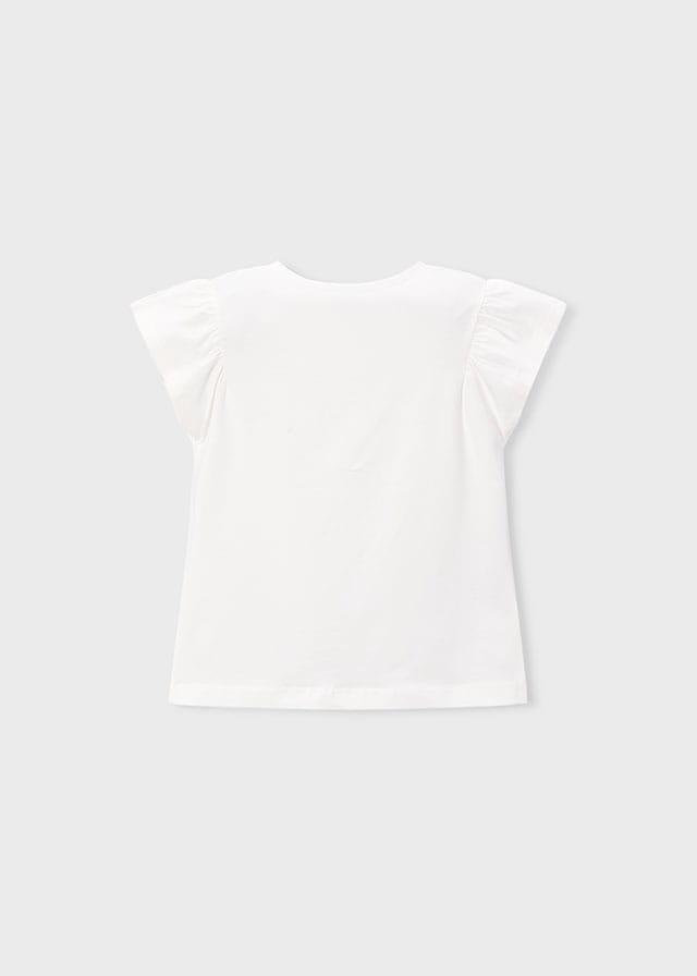 Koszulka z krótkim, motylkowym rękawem dla dziewczynki. Okrągły dekolt. Model z aplikacją z przodu ubranka, tył gładki.