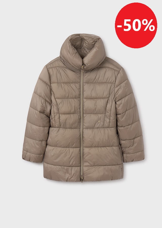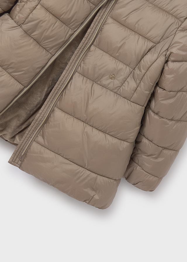 Kurtka zimowa z wysokim kołnierzem, bez kaptura. Posiada ściągacze w rękawkach. Od spodu podszyta przyjemnym misiem. Po bokach dwie kieszenie. Z przodu naszywka z małym logo firmy Mayoral.