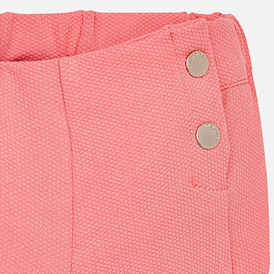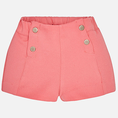 Letnie dziewczęce, szorty o prostym fasonie uszyte z teksturowanego materiału, z talią regulowaną od wewnątrz za pomocą gumek i guzików oraz ozdobnymi zatrzaskami.Element garderoby typu basic, łatwy do dopasowania z letnimi kreacjami.
