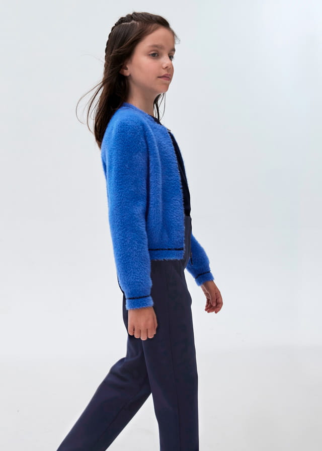 Spodnie typu leginsy dla dziewczynki. Elastyczna gumka w pasie, od spodu wszyta gumka do regulacji. Rozporek zapinany na zemek i zaczep. Z przodu i z tyłu pionowe przeszycia.