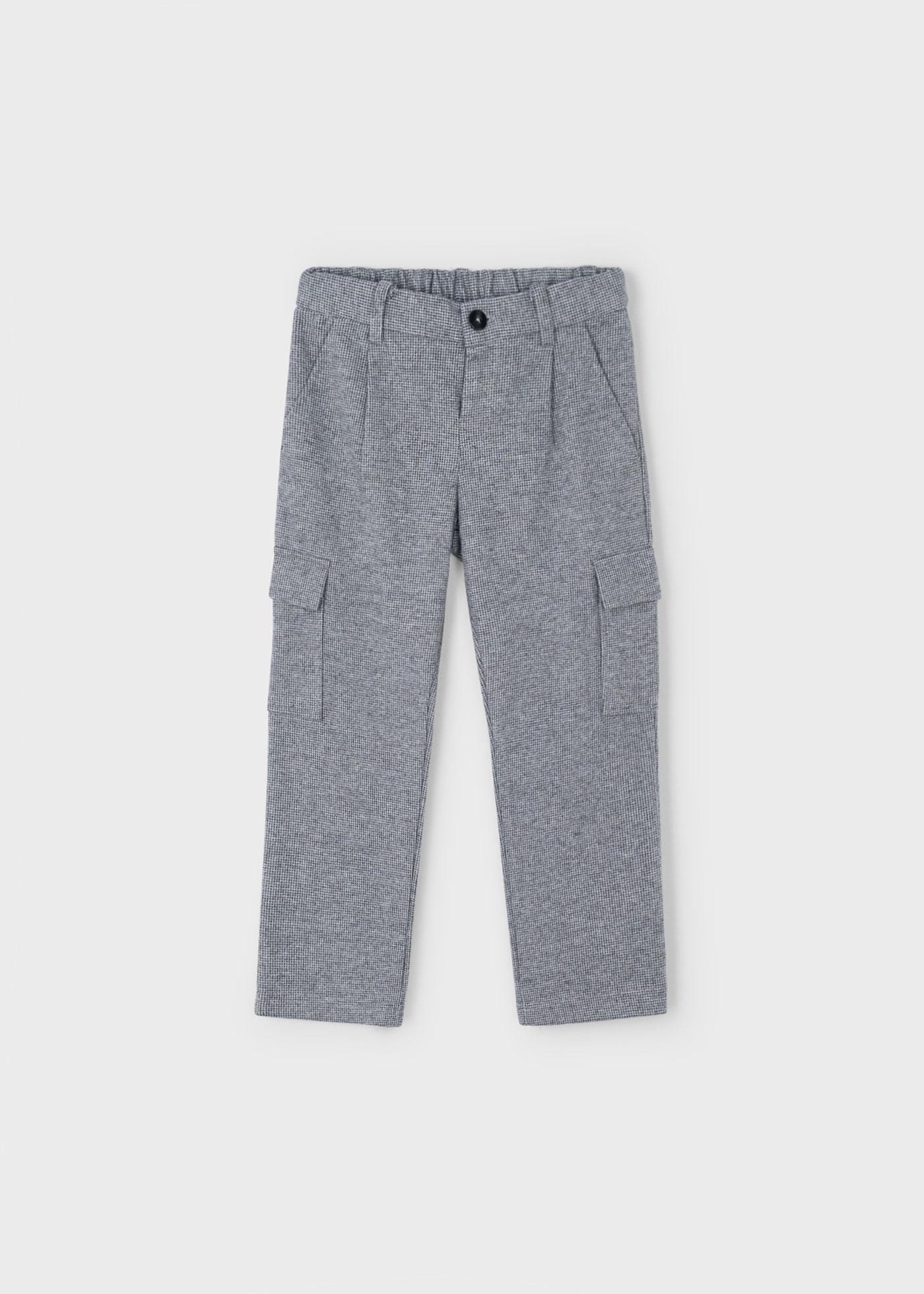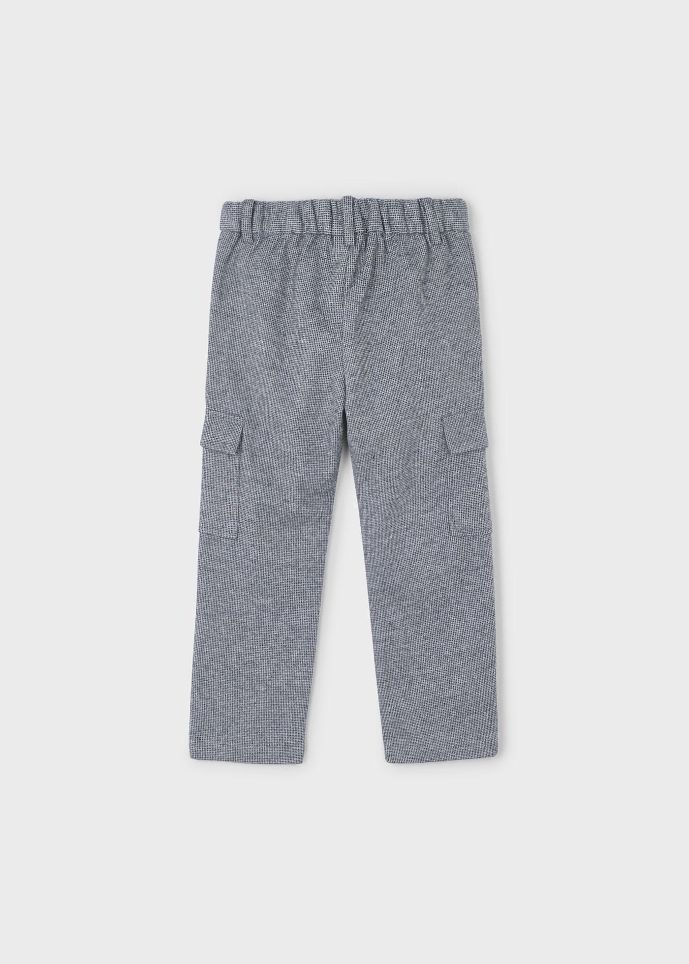Długie spodnie dla chłopca w stylu cargo, poszerzane w górnej części z opadającym stanem, o normalnej szerokości w nogawkach. Zapięcie na zamek i guzik. Regulowana gumka w pasie dla lepszego dopasowania. Model z wieloma kieszeniami. Ze względu na wymogi bezpieczeństwa, mniejsze rozmiary (2-5 lat) posiadają imitację rozporka, bez zamka.