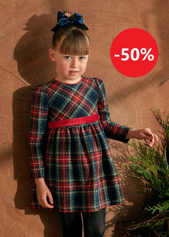 Sukienka z długim rękawem dla dziewczynki. Okrągły dekolt. Zapięcie z tyłu na ukryty zamek. Model składa się z podszewki oraz z materiału w piękną kratę z dodatkiem srebrnej nitki. Do sukienki dołączony jest czerwony, aksamitny pasek z logo firmy mayoral zapinany na guziki.