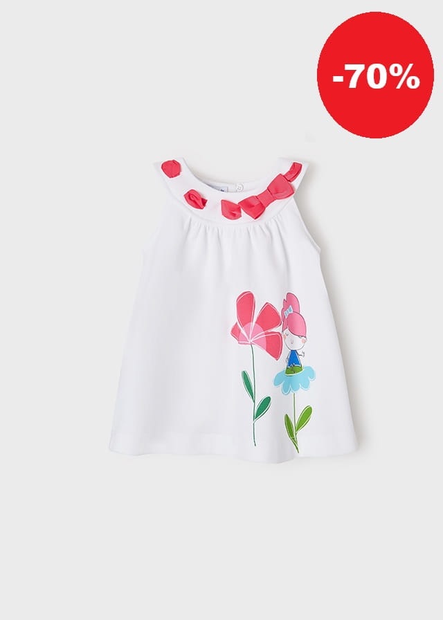 Sukienka na szerokich ramiączkach. Okrągły dekolt ozdobiony kokardką i przeplataną wstążką. Delikatna i elastyczna bawełna, tzw. pika. Projekt z nadrukiem.