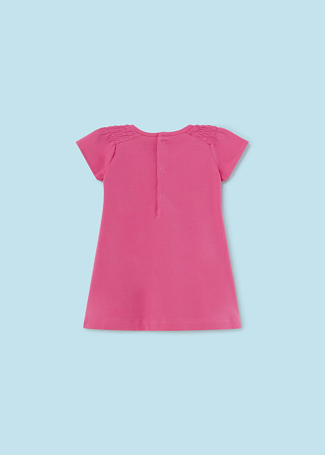 Ubranko ECOFRIENDS, zawiera bawełnę zrównoważoną. Sukienka z krótkim rękawem. Zapięcie na plecach na napy. Na ramionach ozdobne marszczenia. Z przodu nadruk ozdobiony aplikacjami. Materiał miękki i elastyczny.