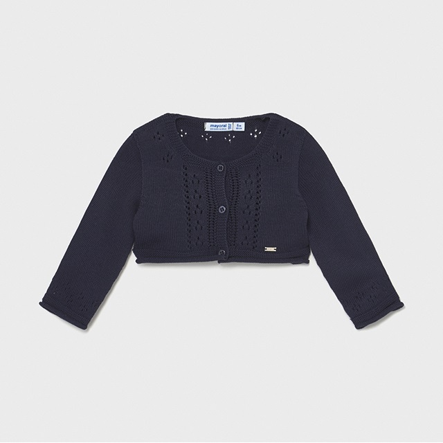 Sweterek z długim rękawem dla dziewczynki. Okrągły dekolt. Krótki model typu bolerko. Zapięcie z przodu na guziki. Trykotowa dzianina, delikatna i przyjemna w dotyku. Ozdoby: elementy ażurowe. Model gładki.