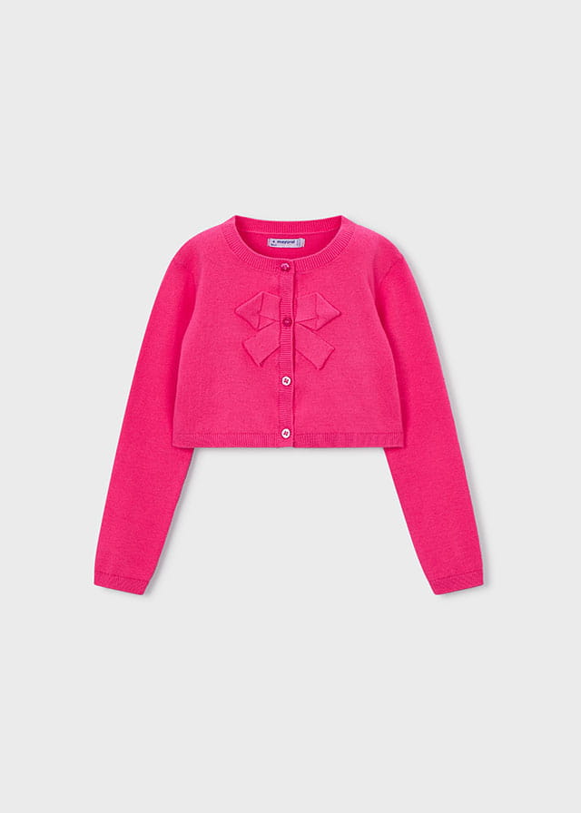Sweterek z długim rękawem dla dziewczynki. Okrągły dekolt. Model z kolekcji basic o klasycznym kroju sięgający do pasa (długość idealna do spódnic i sukienek, ale oczywiście sprawdzi się również jako dodatek do pozostałych stylizacji). Zapięcie na guziki z przodu ubranka, z przodu znajduje się również ozdobna kokardka. Trykotowa dzianina, delikatna i przyjemna w dotyku.