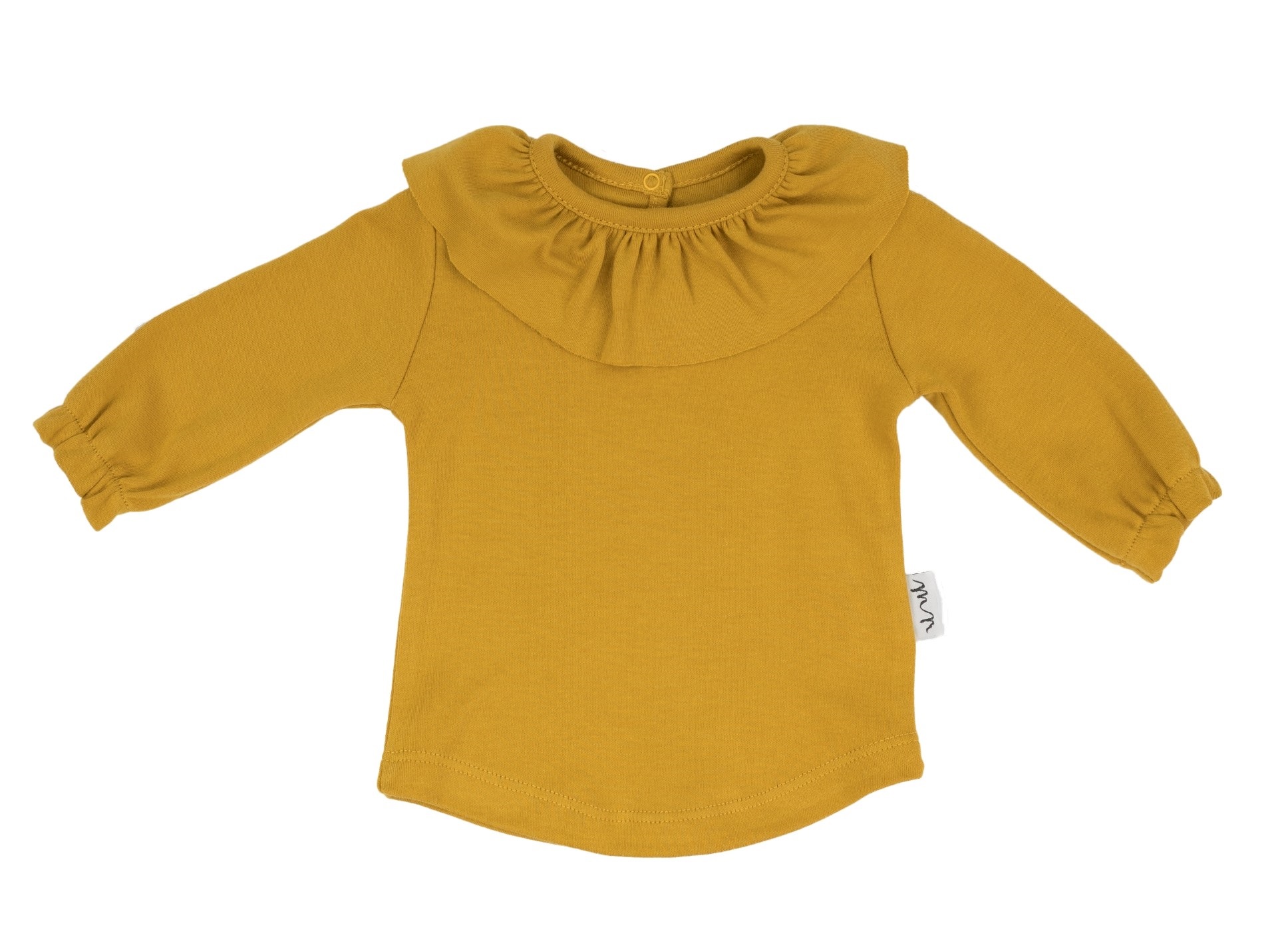 Bluzka w kolorze miodowym. Pod szyją ozdobna falbana, w rękawach wszyte gumki dla lepszego dopasowania ubranka. Ubranko zapinane z tyłu na jeden nap.