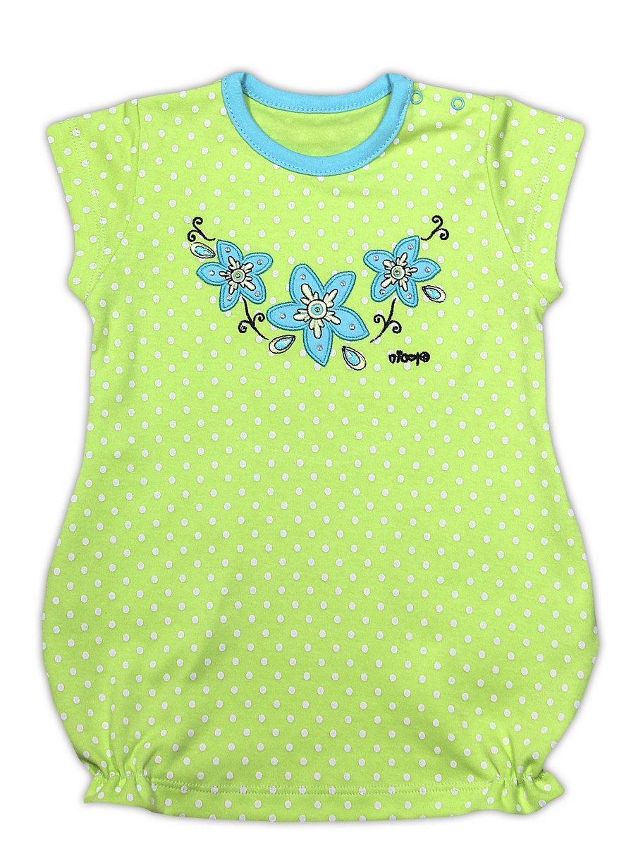 Bawełniana zielona sukieneczka w białe groszki. U dołu wszyta gumka podtrzymująca sukienkę we właściwym miejscu, z przodu naszyta aplikacja.