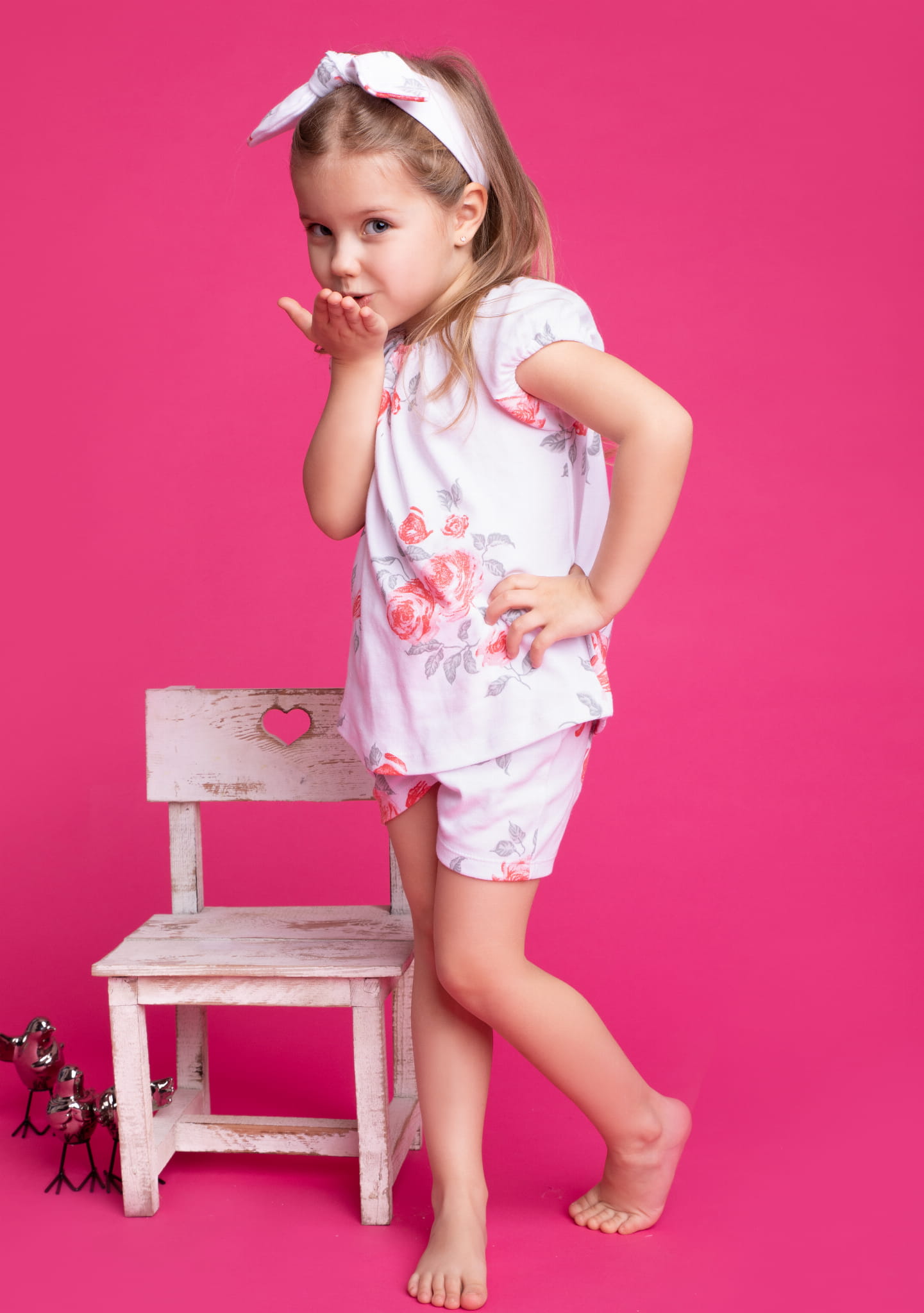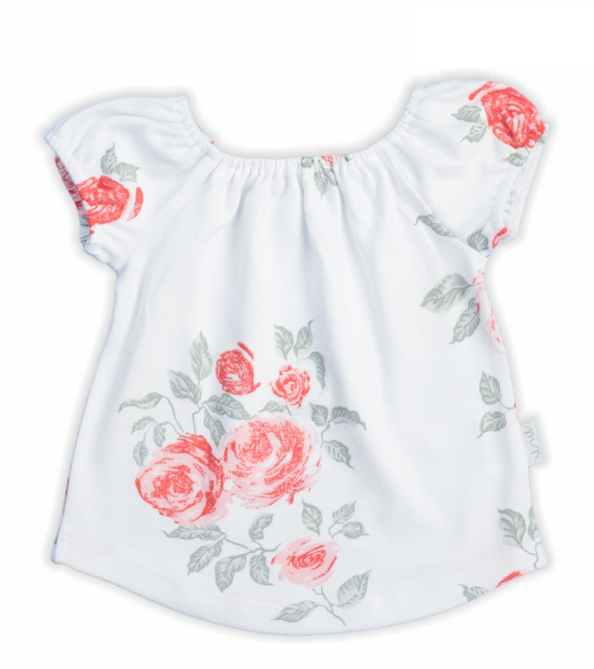 Modna bluzeczka z krótkim rękawem wykonana z bawełny w kolorze białym, we wzorki- kwiatki. Materiał posiada certyfikat Oeko-Tex Standard 100 Tekstylia godne zaufania. Przód zdobi białe serduszko wraz z guziczkiem.