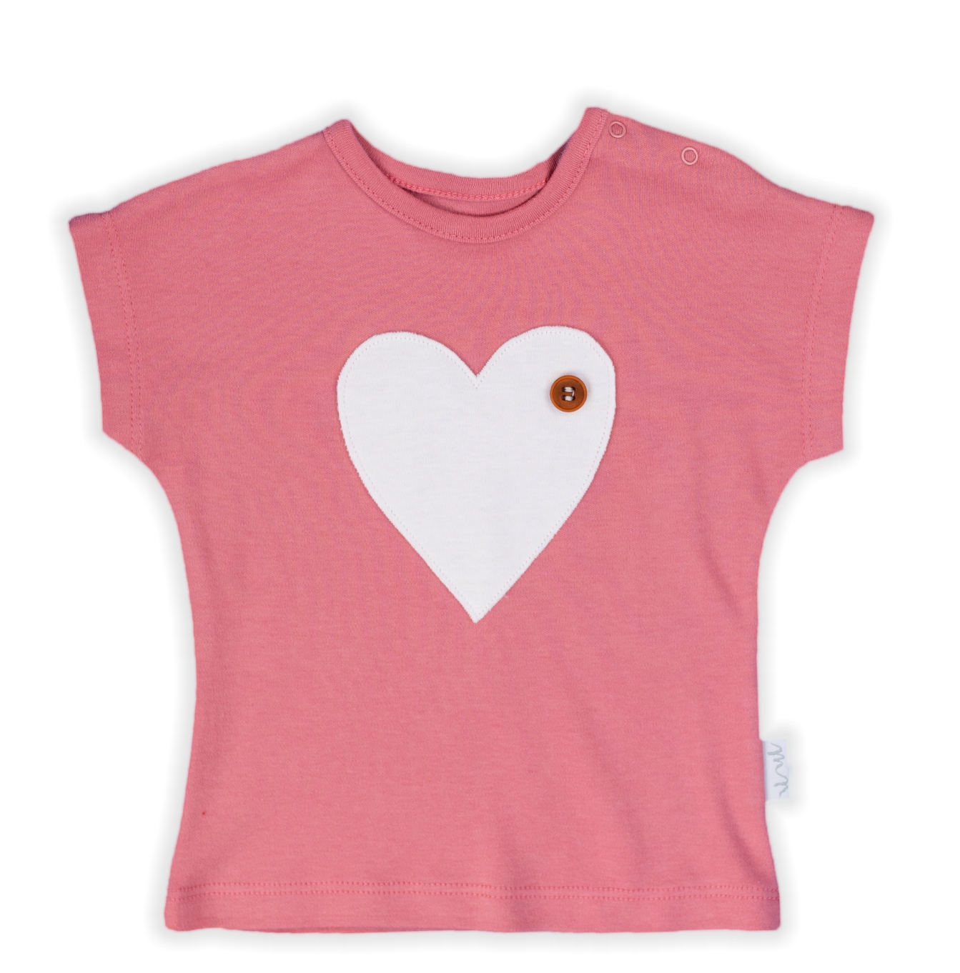 Bluzeczka w kolorze różowym z przodu posiada naszytą aplikację w postaci białego serca. W serduszku wszyty jest dodatkowo ozdobny guziczek. Do rozmiaru 104 bluzka posiada dwa napy na jednym ramieniu co niewątpliwie ułatwia przebieranie dziecka.