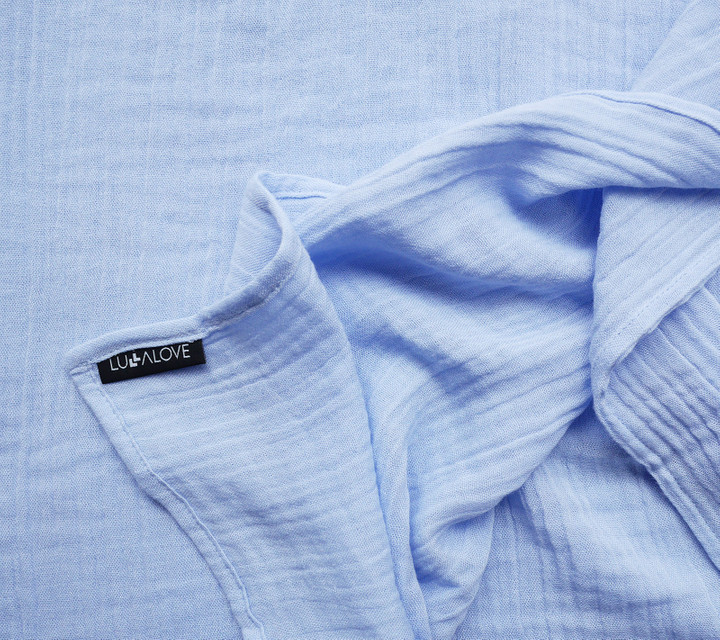Duży otulacz, który łączy w sobie funkcję kocyka i pieluszki, który zastąpi ręcznik i kołderkę w ciepłe dni. Wykonany w 100% w Polsce z tkaniny, która powstała specjalnie dla nas i została wybarwiona, pod naszą ścisłą kontrolą bezpieczeństwa barwników. Materiał składa się z kilku warstw cienkiego muślinu, które zostały połączone razem podczas produkcji i dodatkowo jakby pogniecione - to kreszowanie. Dzięki temu zabiegowi, otulacz zyskał niepowtarzalny plisowany charakter, przy utrzymaniu stonowanej, jednolitej kolorystyki. Zachwyca swoją delikatnością, a przy tym nie jest banalny.