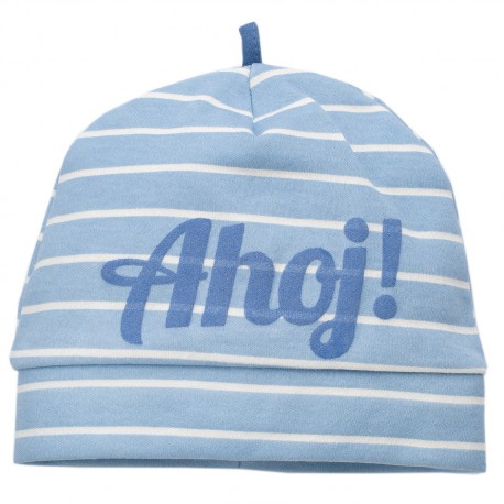 Wygodna, praktyczna, bawełniana czapka to niezbędny element garderoby małego marynarza. Wykonana z doskonałej jakości bawełny interlock, z użyciem starannie dobranych nadruków wodnych. Dostępna w dwóch wariantach kolorystycznych: błękitno białe drukowane marynarskie paseczki i wypukły, ciemno niebieski nadruk – Ahoj!, lub ciemno niebieska czapeczka z wypukłym, jasno niebieskim nadrukiem – Ahoj!. Czapka wykończona jest wesołym ogonkiem z lamówki na szczycie głowy. Dbałość o szczegóły, doskonałej jakości nadruki wodne i precyzyjne wykończenie zapewniają trwałość produktu i spójny design.